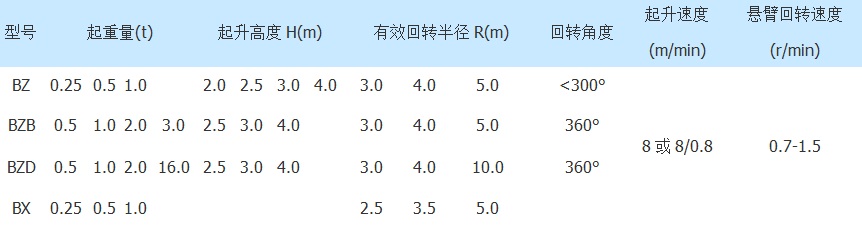 产品说明: BZ、BZB、 BZD型旋臂起重机(也称柱吊)是与电动葫芦配套使用的一种起重机,本起重机由立柱,回转臂回转驱动装置及电动葫芦组成,立柱下端通过地脚螺栓固定在混凝土基础上,由摆线针轮减速装置来驱动悬臂回转,电动葫芦在悬臂工字钢上作左右直线运行,并起吊重物。 本起重机结构简单,占地空间少,作业范围大,操作方便,转动灵活,适用于码头,仓库及车间等固定场所,起重机设有安全保护装置和极限保护装置,安全可行,是理想的起重机械。